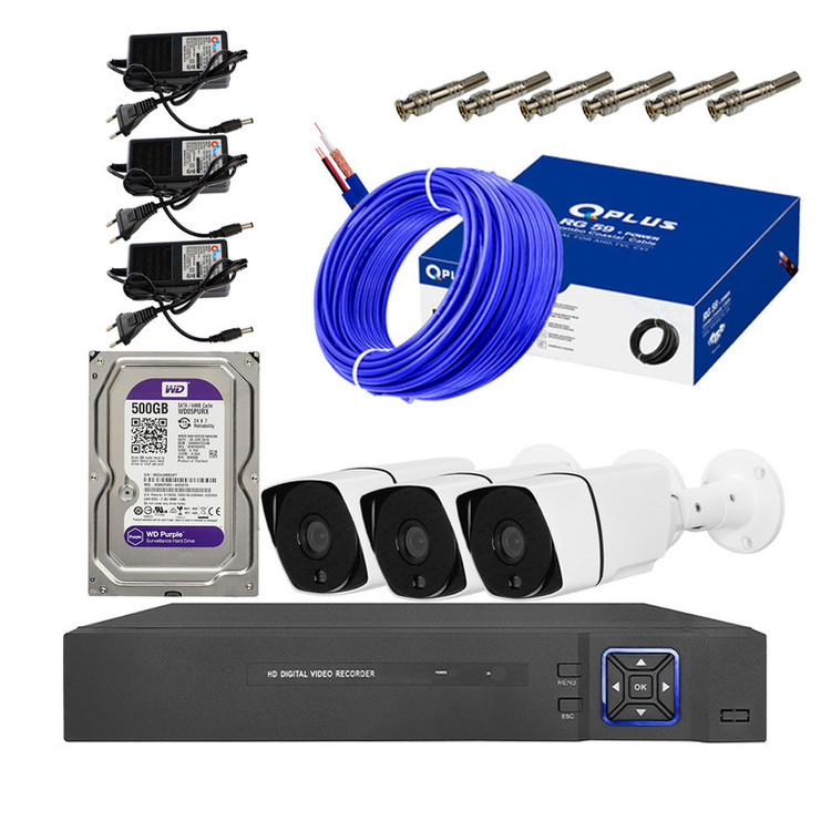 پکیج امنیتی AHD شامل سه دوربین بالت مداربسته AHD دو مگاپیکسلی (ضد آب و دارای دید در شب) مناسب محیط داخلی و فضای بیرون ، یک عدد دستگاه ضبط DVR چهار کانال و هارد 500 گیگ وسترن دیجیتال بنفش و سه عدد آداپتور 2آمپر و 15 متر کابل ترکیبی مغزی 0.7 مس (شامل کابل برق+RG) و 6عدد فیش BNC می باشد.