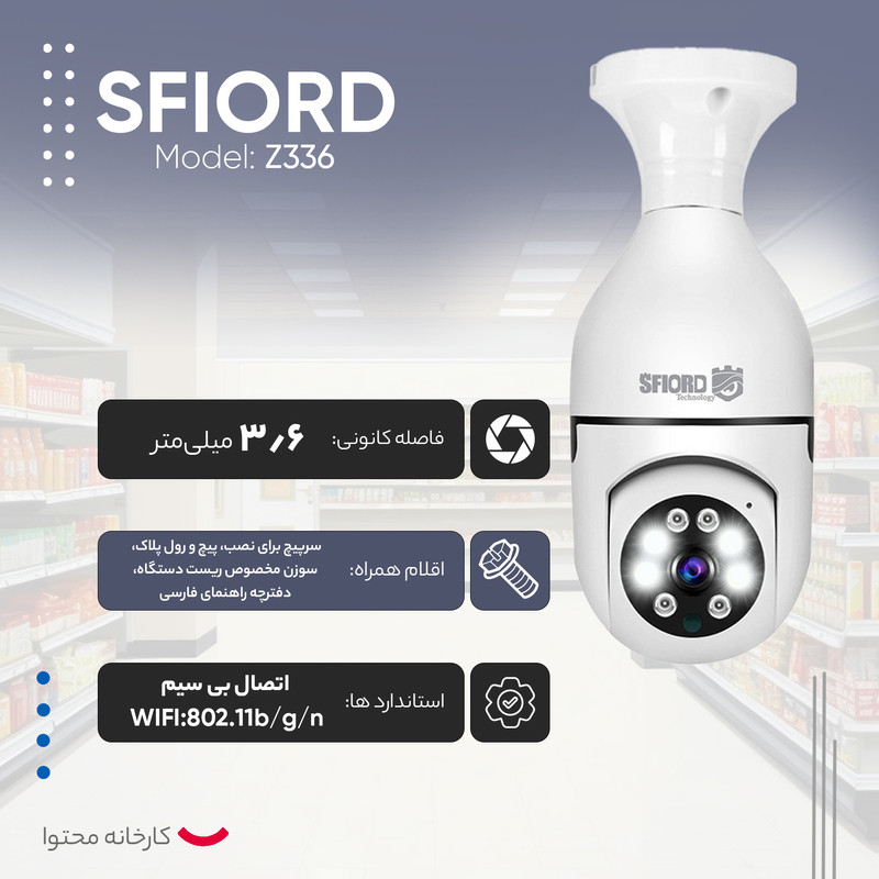دوربین مداربسته اسفیورد مدل Z336 مخصوص گوشی های اندرویدی یک سیستم امنیتی کامل و باکیفیت با قیمتی اقتصادی است که به لطف بهرهمندی از جدیدترین تکنولوژیهای نظارت الکترونیک، عملکرد بسیار خوب و قابل قبولی ارائه میدهد. اپلیکیشن اندروید فارسی اختصاصی اسفیورد، امکان ذخیرهسازی تصاویر بر روی فضای ابری (CLOUD)، تکنولوژی دید در شب رنگی (استارلایت)، دزدگیر هوشمند با قابلیت تشخیص حرکات انسان و پخش آژیر و ارسال پیامک (SMS)، تکنولوژی دوآل اسکرین (نمایش دو تصویر همزمان) از مهمترین ویژگیهای این دوربین مداربسته اسفیورد هستند. (این دوربین صرفاً بر روی گوشیهای اندروید قابل استفاده است و بر روی گوشیهای شرکت اپل پشتیبانی نمیشود.) نصب سریع و ساده این دوربین بر روی تنها یک سرپیچ، یکی دیگر از امتیازهای آن است. مشابه سایر دوربینهای اسفیورد، این مدل نیز از سرورهای امن چندلایه انتقال تصویر P2P با مصرف اینترنت نیمبهای داخلی برای نمایش تصویر دوربین بر روی موبایل استفاده میکند. دوربین Z336 دارای کیفیت تصویر ۳MPX است که تصاویر را با کیفیت FULL HD ذخیره میکند. برای راهاندازی این دوربین نیازی به دستگاه ضبط و سیمکشی نیست و تنها کافی است نرمافزار مربوطه را روی گوشی موبایل نصب کرده و مطابق دفترچه راهنمای فارسی، دوربین را به مودم اینترنت متصل کنید تا بتوانید صدا و تصویر را بهراحتی بر روی گوشی موبایل از هر نقطه ایران مشاهده کنید. این دوربین بدون نیاز به اینترنت، صدا و تصویر را بر روی کارت حافظه ذخیره میکند و فقط کافی است یک مموری کارت microSD تا ظرفیت ۱۲۸ گیگابایت تهیه کنید. بازپخش تصاویر ضبطشده بهوسیله نرمافزار موبایل انجام میشود و بهراحتی میتوان از آنها خروجی گرفت. این دوربین برای نصب در فضاهای داخلی ساختمان مناسب است و امکان اشتراکگذاری تصاویر زنده روی موبایل تا ۱۰ نفر را فراهم میکند.